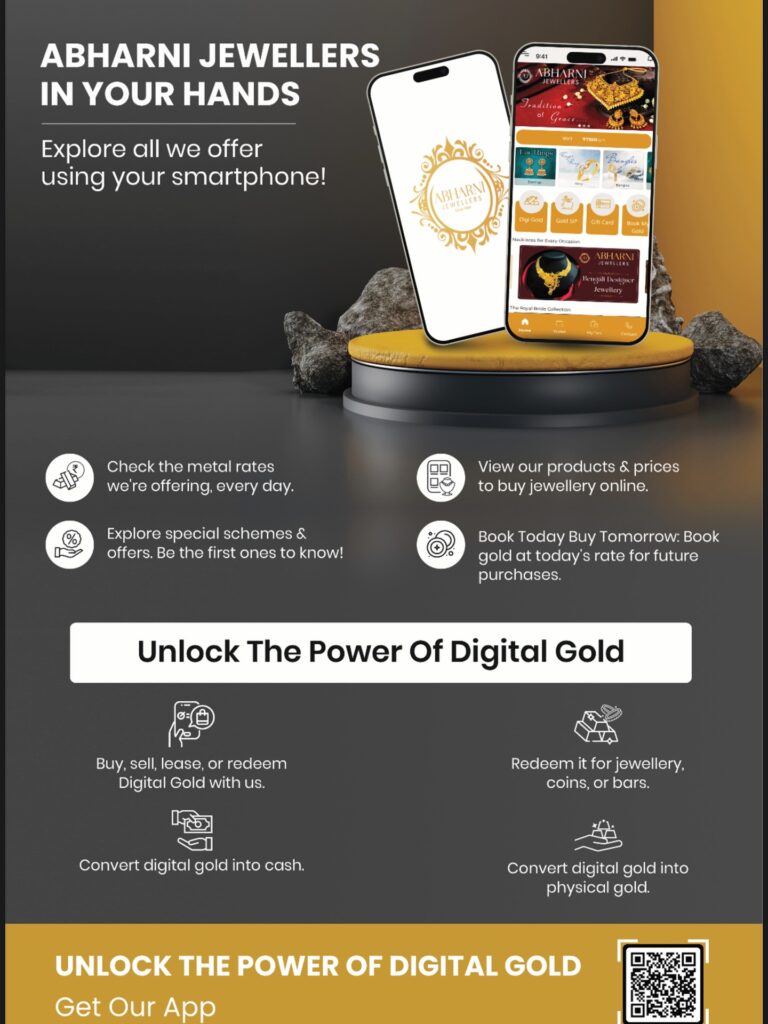 The Abharni Jewellers Mobile App is a digital platform that lets users explore and shop handcrafted Bengali jewellery directly from their smartphones. It allows customers to access Abharni Jewellers Store from the convenience of their phone. The app allows users to buy digital gold, make installment payments for gold schemes, and browse through Abharni Jewellers product catalogue.